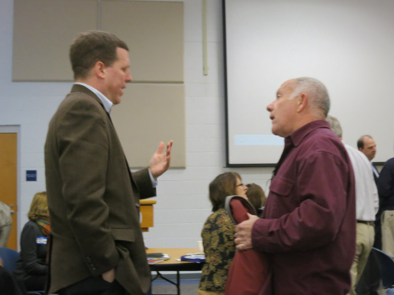 Neil Andersen, on right, discusses a point with Andy Brydges before meeting. Photo by Kurt Tramposch.