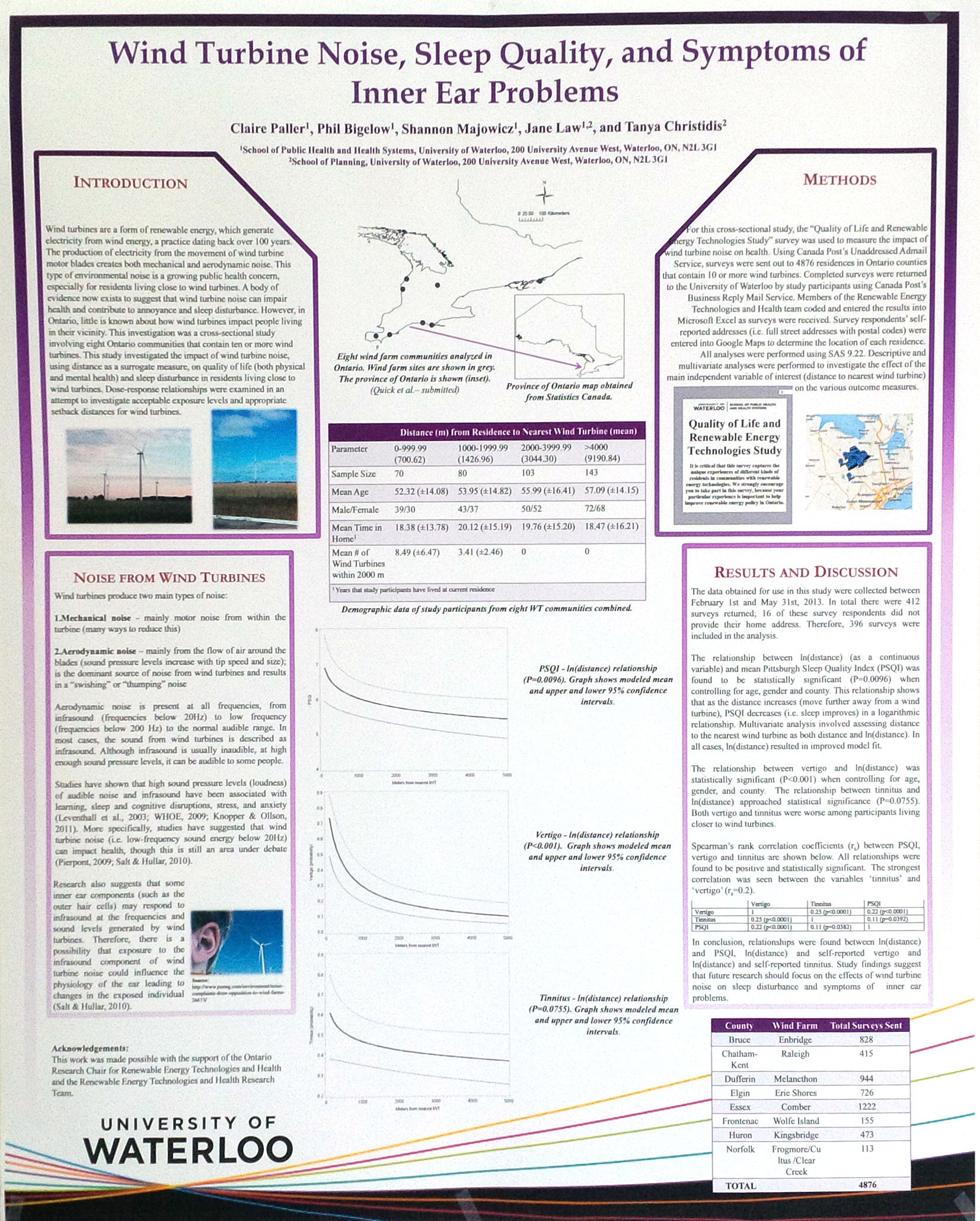 “In conclusion, relationships were found between ln(distance) and PSQI, ln(distance) and self-reported vertigo and ln(distance) and self-reported tinnitus. Study findings suggest that future research should focus on the effects of wind turbine noise on sleep disturbance and symptoms of inner ear problems.”