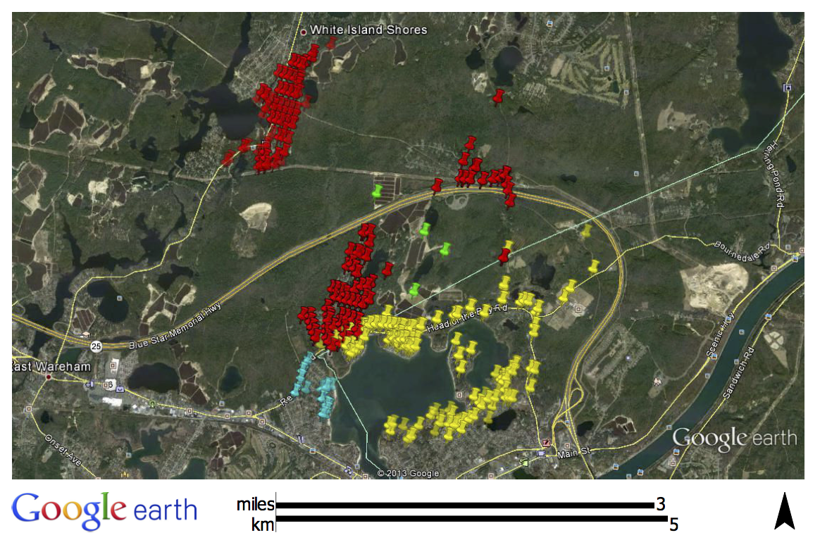 Map credit: Dick Mann. Legend: Green pins mark 4 turbines; yellow pins mark residential streets in Bourne, red pins are in Plymouth, blue are in Wareham.
