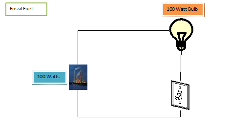 To illustrate how fossil fuel power plants operate, Figure 1 shows a fossil fuel power plant connected to a 100 watt light bulb through a switch. Even though fossil fuel plants generally can provide power measured in megawatts, for simplicity we can assume that the nameplate rating here will be 100 watts. With the switch off and the power plant running, we can say that 100 watts of power is available to power the light bulb as soon as the switch is turned on. In this state the power plant is producing no energy. However, it is consuming fuel that goes into generating waste heat. As soon as the switch is turned on, electric energy begins to flow from the power plant to the light bulb causing the light bulb to produce the rated amount of light. If we leave the light on for an hour, then we can say that the light bulb has consumed 100 watt-hours of energy which is equal to the amount of energy that was produced by the power plant. The amount of fuel used is dependent on how long the plant is running with the switch off and how long the plant runs with the switch on.