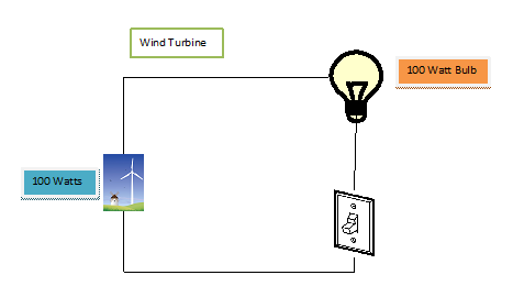 A couple of points to remember. When the power plant is running it is producing 100 watts of power. However, it is not producing any energy until it is connected to the load (light bulb). This scenario can be scaled up without violating any of the principles involved. Let’s say that the average house with all of its electrical things turned on needs 10,000 kilowatts, then, a one megawatt power plant can supply power to 100 houses.