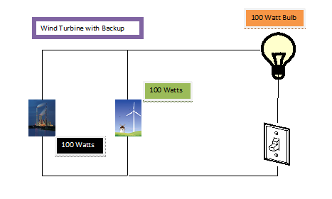To overcome the intermittent operation of wind turbines and wind farms, backup with fossil fuel is a necessity. Figure 3 shows a 100 watt wind turbine with a 100 watt backup power plant. The two are designed to work in synchronism so that 100 watts of power is always available for the light bulb. When the wind is between 26 and 56 mph the fossil fuel plant is running in what is called spinning reserve, ready to compensate for any fluctuation of wind power including total shut down. At grid level this is known as fortifying wind to maintain grid balance.