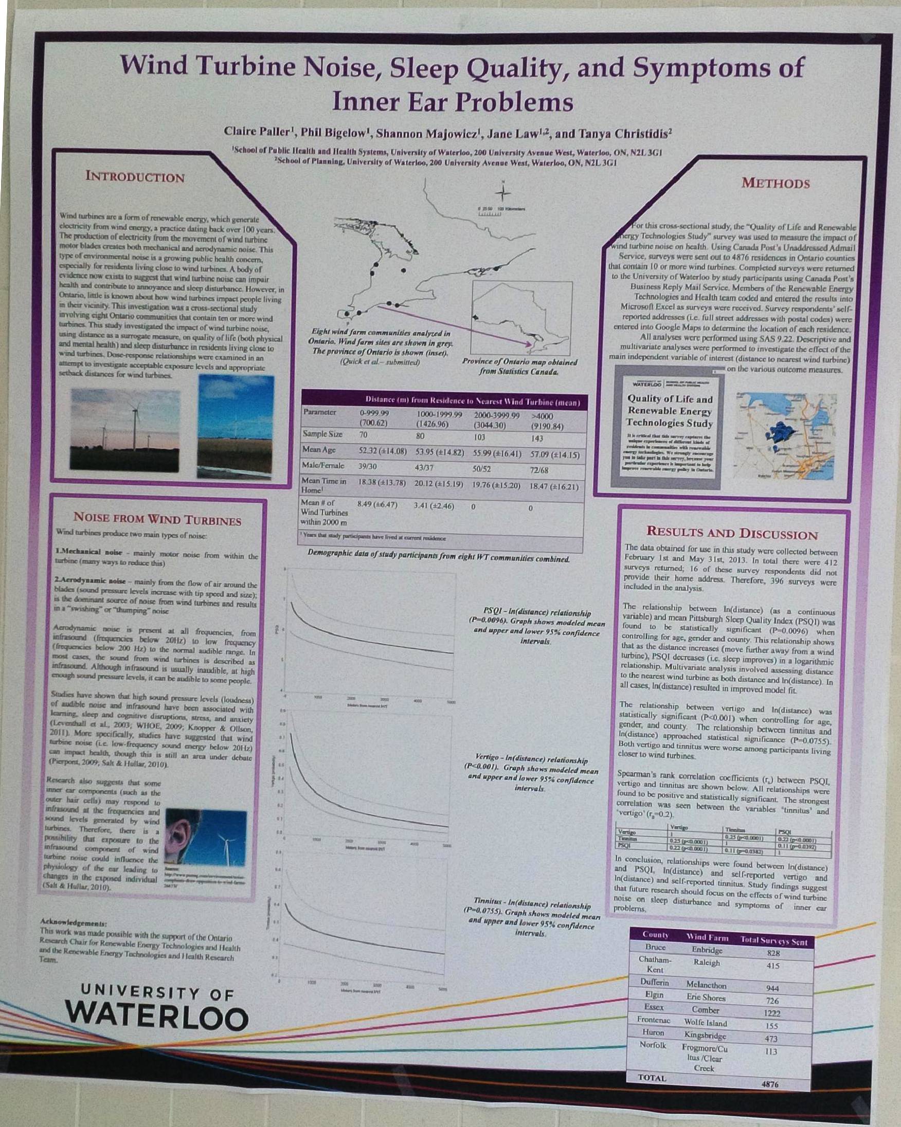“In conclusion, relationships were found between ln(distance) and PSQI, ln(distance) and self-reported vertigo and ln(distance) and self-reported tinnitus. Study findings suggest that future research should focus on the effects of wind turbine noise on sleep disturbance and symptoms of inner ear problems.”